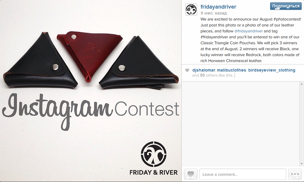 Friday and River продают изделия из кожи ручной работы. В течение месяца они проводили фотоконкурс в Instagram. Участники должны были подписаться на компанию в Instagram и загрузить свое конкурсное фото с использованием изделия Friday and River, указав специальный хэш-тег. По итогам конкурса, выбирали трёх победителей. Приз – кожаный кошелёк Friday and River, только поступивший в продажу.