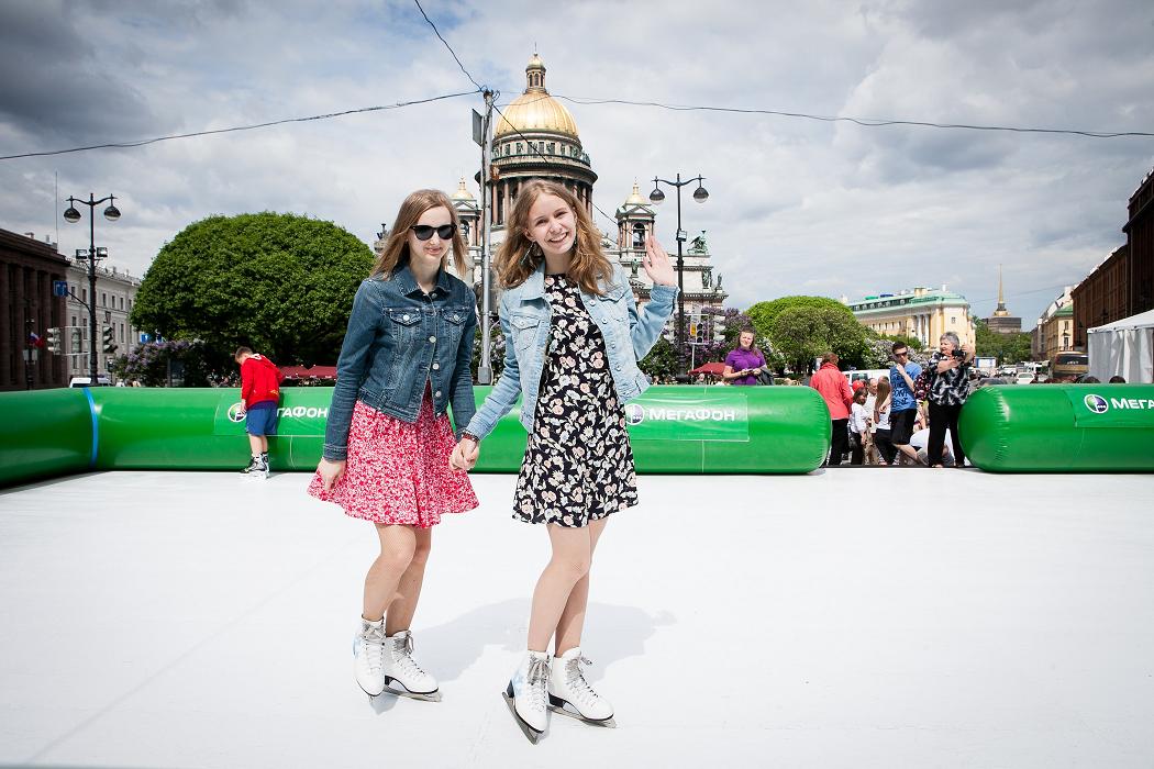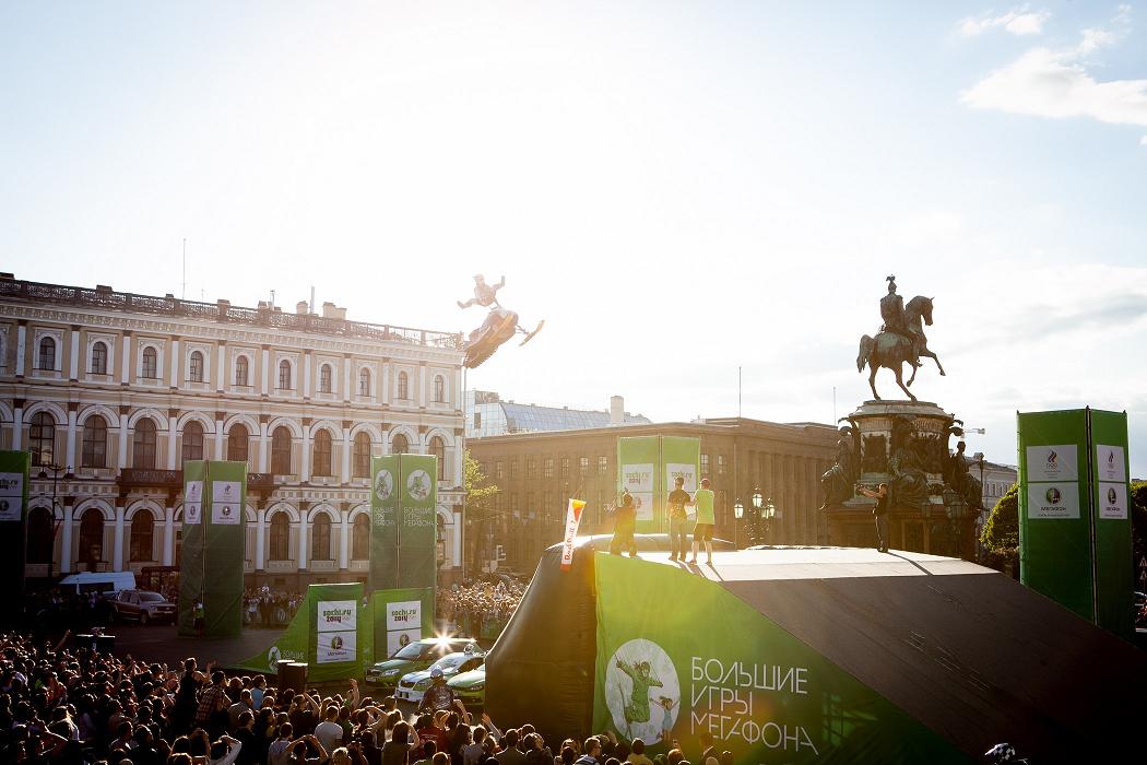Под жаркими лучами солнца в самом центре северной столицы на Исаакиевской площади происходило нечто невообразимое – гости «Больших игр МегаФона» могли не только насладиться яркой танцевальной и музыкальной программой, но и поиграть в хоккей с мячом, посоревноваться в биатлоне, пройти виртуальную трассу слалом и даже разогнать боб на колесах. Около памятника Николаю I развернулся белоснежный каток, который принес на фестиваль настоящую зиму. Все смогли поучаствовать в зимних играх и стать частью Олимпийской истории.