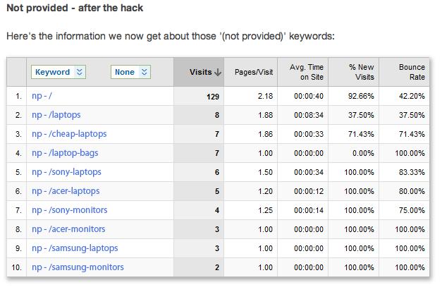Дэн Баркер (Dan Barker) написал об этом «взломе» данных Google Analytics в блоге на eConsultancy еще в 2011 году, когда на пункт «Not Provided» приходилось не более 33% данных. Дэн подробно рассказывает, как нужно поменять настройки Analytics, и подчеркивает, что такой обходной маневр позволяет владельцам сайта выявить ключевые слова, попавшие в группу «Not Provided», и связать их со страницей входа. Пошаговые иллюстрации демонстрируют происходящие изменения: