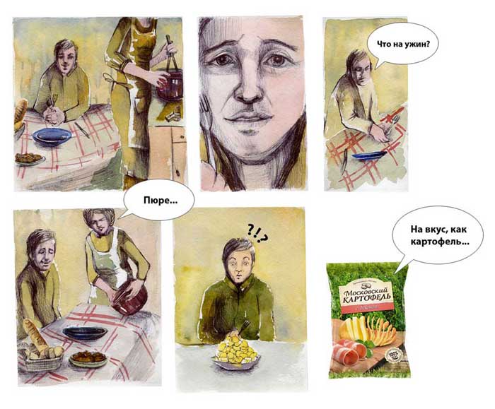 Женщина разворачивается, наклоняется с кастрюлей над тарелкой мужчины и отвечает: «Пюре».
