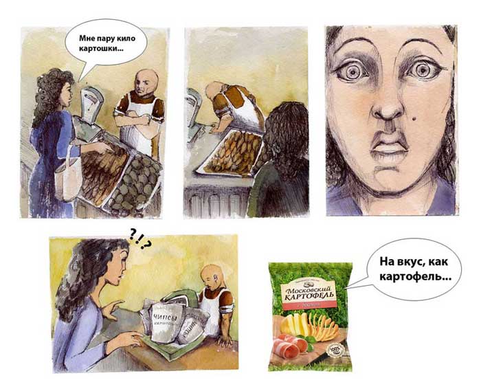 На рынке перед прилавком с картошкой стоит женщина. Из-за прилавка на нее смотрит хмурый продавец. Женщина говорит ему: «Мне пару кило картошки». Продавец наклоняется за прилавок, чтобы, видимо, достать картошку.