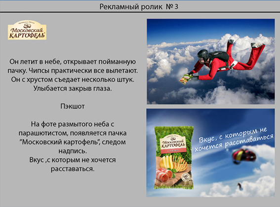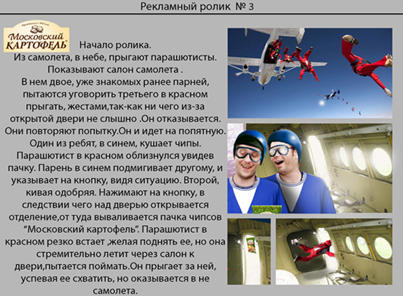 Из самолета, в небе, прыгают парашютисты. Показывают салон самолета . В нем двое, уже знакомых ранее парней, пытаются уговорить третьего в красном прыгать, жестами,так-как ни чего из-за открытой двери не слышно .Он отказывается. Они повторяют попытку.Он и идет на попятную. Один из ребят, в синем, кушает чипы. Парашютист в красном облизнулся увидев пачку. Парень в синем подмигивает другому, и указывает на кнопку, видя ситуацию. Второй, кивая одобряет. Нажимают на кнопку, в следствии чего над дверью открывается отделение,от туда вываливается пачка чипсов “Московский картофель”. Парашютист в красном резко встает ,желая поднять ее, но она стремительно летит через салон к двери,пытается поймать.Он прыгает за ней, успевая ее схватить, но оказывается в не самолета. Он летит в небе, открывает пойманную пачку. Чипсы практически все вылетают. Он с хрустом сьедает несколько штук. Улыбается закрыв глаза.