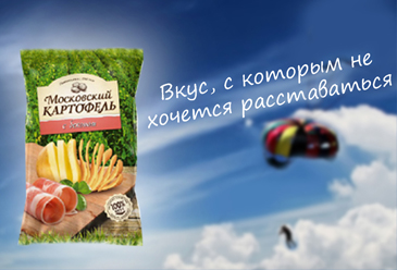 На фоте размытого неба с парашютистом, появляется пачка “Московский картофель” , следом надпись. Вкус ,с которым не хочется расставаться.