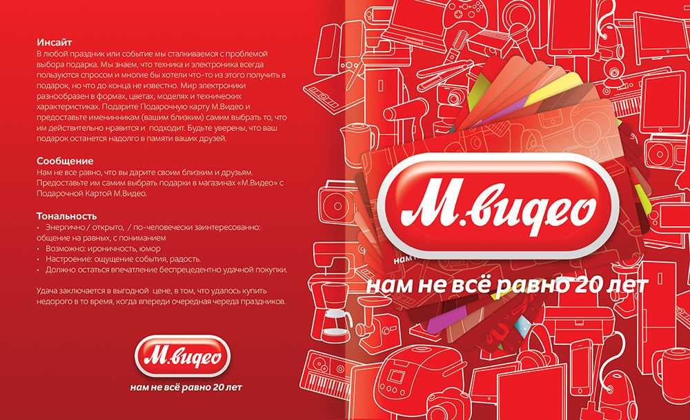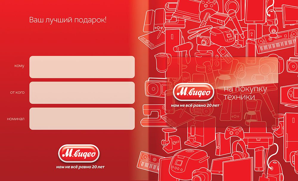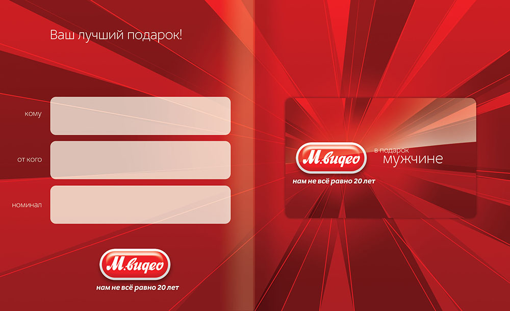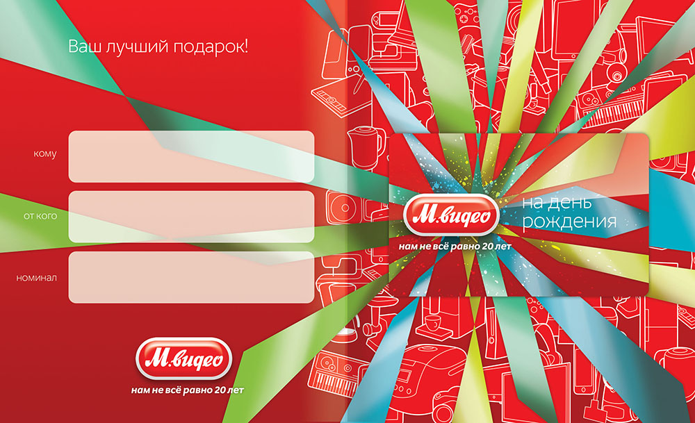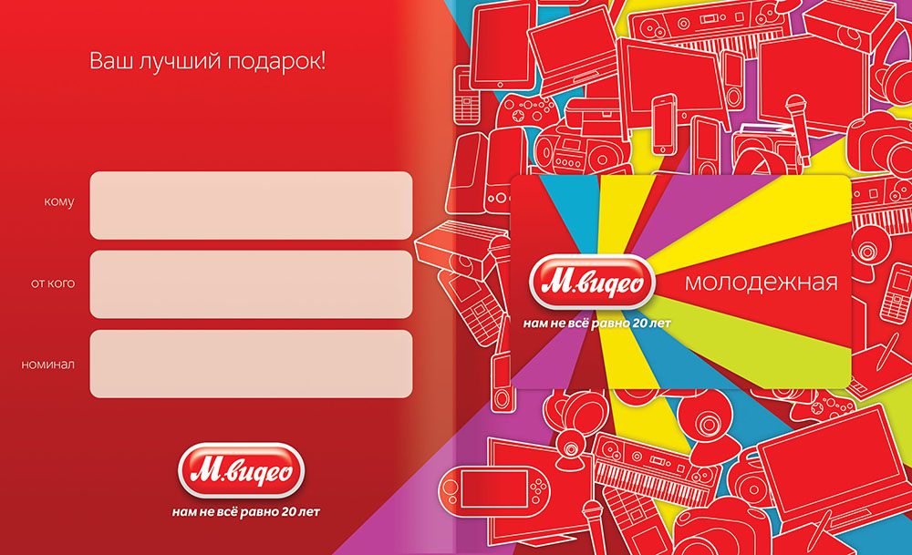 Крупнейший российский ритейлер бытовой техники и электроники «М.Видео» совместно с Sostav.ru запускает креативный конкурс, приуроченный к 20-летию компании. Читателям нашего портала предлагается разработать дизайн подарочных карт, которые будут использоваться в магазинах торговой сети. Авторы лучших работ будут награждены ценными подарками: MacBook Pro, iPad 4 Retina и iPad Mini.