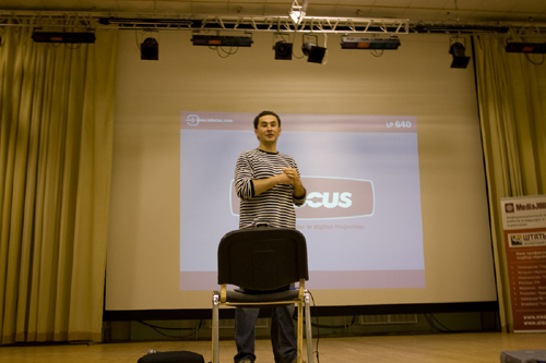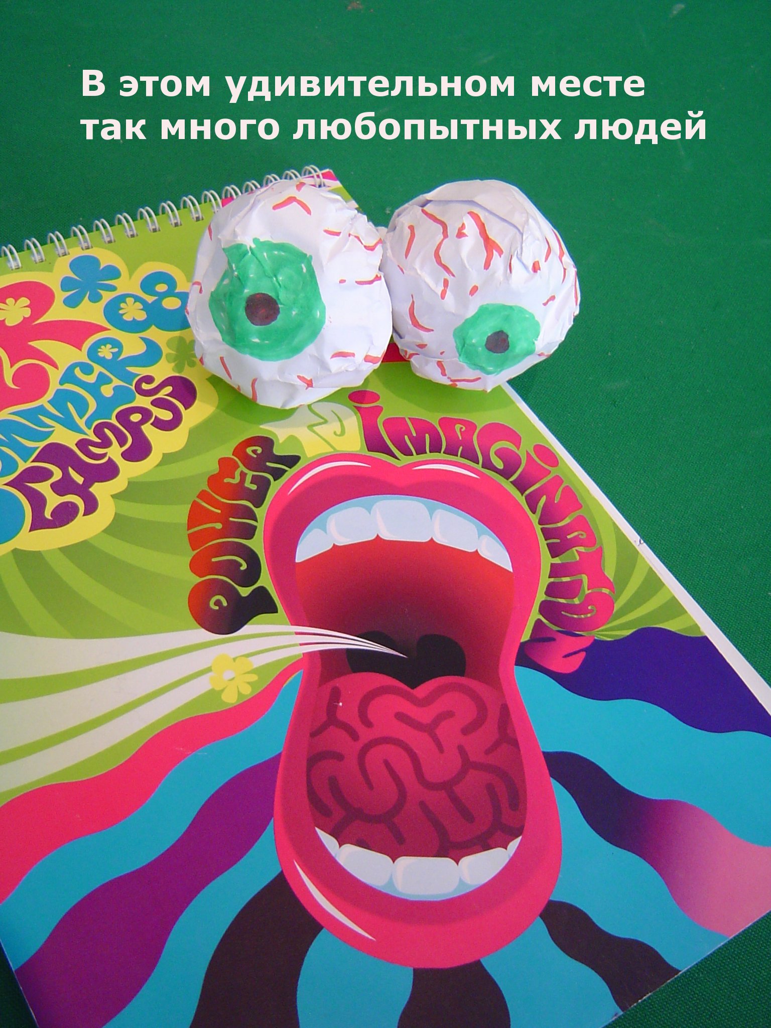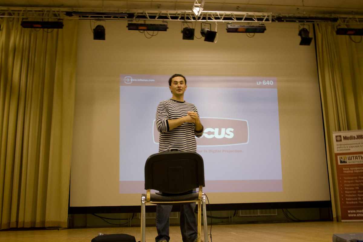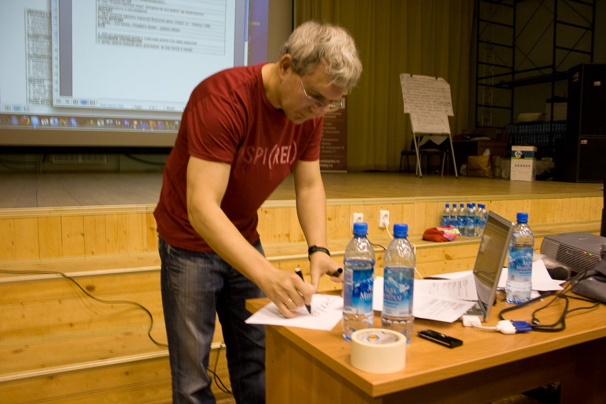 Так, пытаясь найти свежие и уникальные образы, участники скрещивали кардинально разные вещи и концепции - глаз и пылесос, осьминога и топор. «Мышка Аманда», игравшая с крокодилом и лампочкой, предложила постер с Чубайсом, который плачет крокодиловыми слезами в форме лампочек, а «Танец Кащенко», соединив осьминога и топор, получила рекламу ресторана «Веселый Кракен»: на столе вместо ножа рядом с вилкой и тарелкой лежит топор. По итогам задания Фейгин вывел формулу успешного привлечения: Iсердце!. Где I обозначает информацию, сердце - эмоциональную окраску сообщения, связку с желаниями жить, быть любимым и быть круче всех, а восклицательный знак говорит о том, что этот месседж надо ярко подать. Вторая часть мастер-класса была посвящена поиску сильных образов. Участники искали в окружающей среде и интерьере предметы, чтобы, приложив к ним 2 нарисованных глаза, получить яркое и выразительное послание, которое должно соответствовать выбранной ценности. Вот, что у них получилось:
