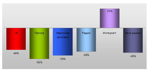 В 2009 г. казахстанский рынок рекламы продемонстрировал снижение объемов рекламы по всем типам медианосителей. Согласно экспертной оценке ВИ- Казахстан, максимальное сокращение рекламных бюджетов наблюдается в прессе -56% (27 $ млн без НДС в 2009 к 61 $ млн без НДС в 2008) и в наружной рекламе -50% (13 $ млн без НДС в 2009 к 27 $ млн без НДС в 2008).