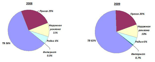 Доли рекламных бюджетов по сегментам в 2008-2009 гг.,%