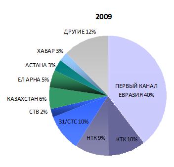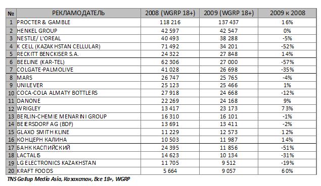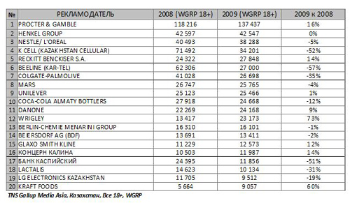 Объем выкупленных пунктов (GRP"30) TOP 20 в 2009 г. составил - 72% всех реализованных "коммерческих" рейтингов, доля бюджета TOP 20 составила при этом 67% (57,1 $ млн. без налогов). По данным ВИ-Казахстан, рекламные расходы первой десятки рекламодателей составили - 48% ( ~ 41 $ млн. без НДС).