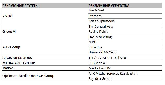 На сегодняшний день в Казахстане функционируют представительства следующих рекламных групп: