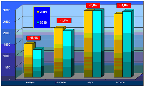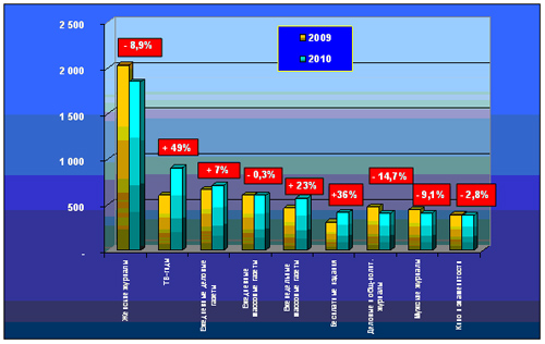 Но помесячная динамика рекламы в центральной прессе к апрелю обозначила вполне оптимистичный тренд. Конечно, по итогам 4 месяцев пресса все еще в минусе относительно провального прошлого года, да и мировая экономика не радует хорошими новостями, но тем не менее... Каждый последующий месяц показывал все лучшую динамику, пока апрель, наконец, не вышел в плюс относительно апреля прошлого года. Тут важно отметить, что в апреле 2009 года как раз стабилизировалась динамика рынка (прекратилось резкое нарастание процентов падения доходов), поэтому нынешний выход в плюс является вполне реальным.