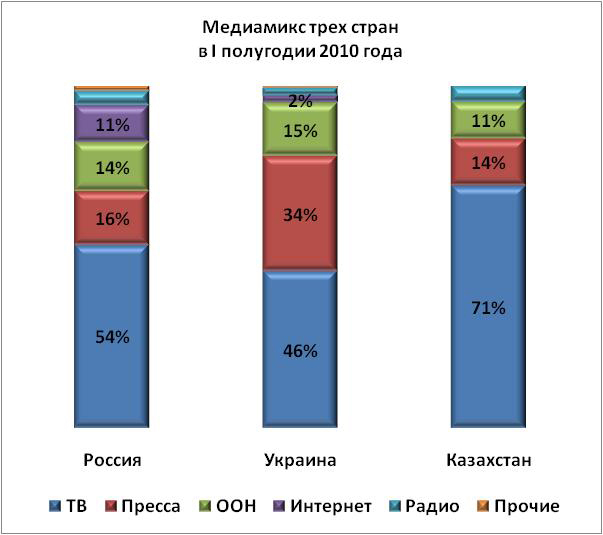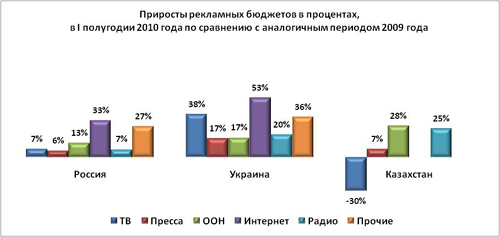 Доля Интернета в медиамиксе значительно меньше по сравнению с ТВ, но бюджеты увеличиваются гораздо более уверенно: в России +33%, в Украине +53%. В Казахстане интернет не измеряется, поэтому сложно определить его размер. Но 17%-ый прирост доли нетелевизионных СМИ за 6 месяцев 2010 года (по отношению к аналогичному периоду 2009) свидетельствует о большом потенциале digital-media. Отставание развития интернета в Украине и Казахстане связано с его низким проникновением, что в свою очередь зависит от технической инфраструктуры.