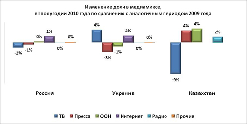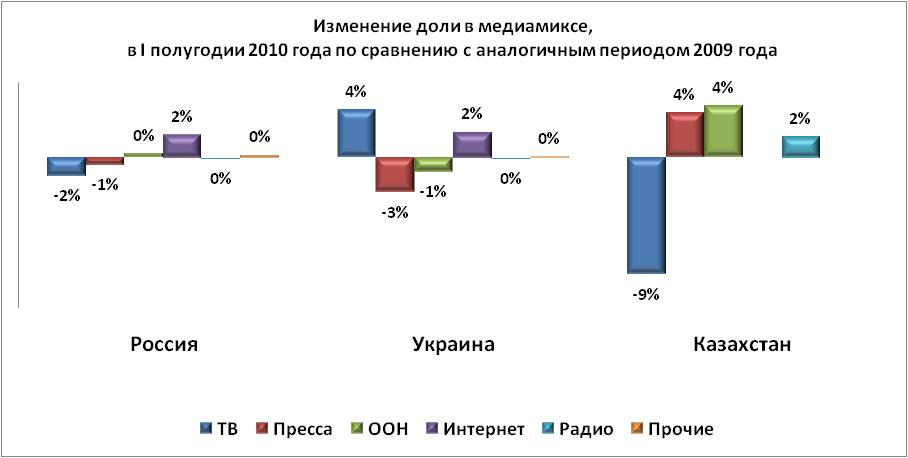 Результаты первого полугодия 2010 года, по сравнению с аналогичным периодом 2009 года, показывают, что телевидение, все больше ощущает нарастающее давление, как со стороны интернета, так и остальных СМИ. В России доля ТВ в медиамиксе снизилась на 1%, а прирост бюджетов составил 7%. В Украине доля ТВ в медиамиксе увеличилась на 4%, а прирост бюджетов составляет 38%. При этом, народные депутаты Украины предлагают сократить допустимый объем рекламы в ТВ эфире с 20% до 15% в час, и обязать телеканалы показывать счетчик обратного отсчета (время до окончания рекламного блока). В Казахстане доля ТВ в медиамиксе уменьшилась на 9%, а бюджеты сократились на 30%. Это происходит за счет снижения рекламодателями своих рекламных вложений и их перераспределения в нетелевизионные медиа.