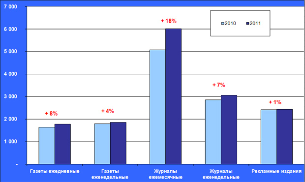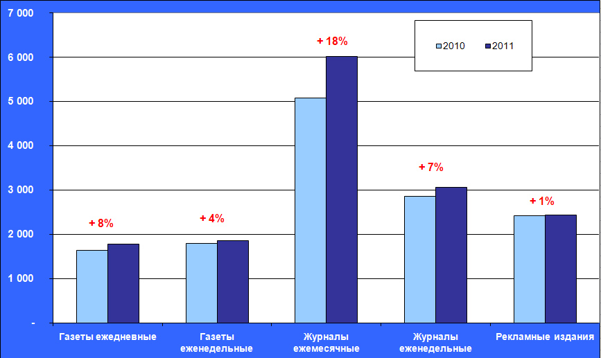 Среди издательских ниш до сих пор остаются такие, чьи доходы продолжают сокращаться. Особо заметно падение по массовым газетам, которые пережили кризис значительно благополучней многих других изданий. Журналы в своей массе, напротив, более уверенно оправляются от последствий кризиса. Из нерекламных изданий, пожалуй, только путеводители по развлечениям портят общую идиллическую картину. Среди рекламных изданий практически все находятся в минусе, но небольшой плюс этой группе изданий обеспечивают отдельные газеты и журналы с хорошими приростами доходов. Впрочем, часть из них показали высокие приросты в основном за счет роста цен на рекламу, а не за счет прироста рекламных площадей. Беда в том, что об этих сегментах прессы мы имеем крайне разрозненную и противоречивую информацию.