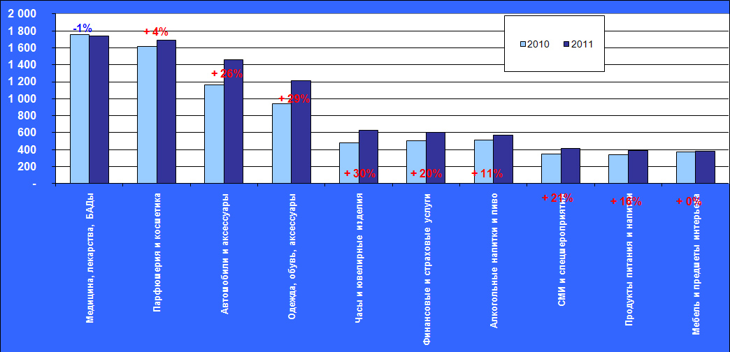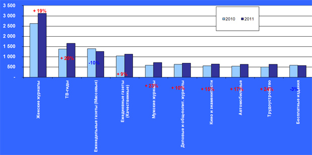 Среди товарных категорий также есть те, которые сокращают свои рекламные бюджеты в прессе. Прежде всего, это «Медицина, лекарства, БАДы», которая за время кризиса выбилась в лидеры. Теперь по ней наблюдается сокращение на 1%, но она все еще остается на первом месте. Сокращение объясняется тем, что крупнейшие производители БАДов резко увеличили свои телерекламные бюджеты, для чего, возможно, им пришлось сократить их в газетах и журналах. Докризисный лидер – «Автомобили и аксессуары» – пока все еще на третьем месте, хотя начал быстро наращивать свои рекламные расходы на печатные СМИ. Ну и очень высокие приросты по таким ключевым категориям, как «Одежда, обувь, аксессуары», «Часы и ювелирные изделия», «Финансовые и страховые услуги» как раз и обеспечили относительно неплохой рост доходов журналов.