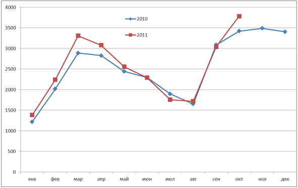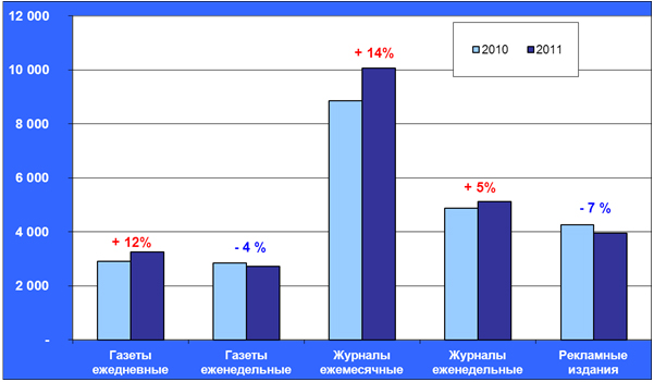 Таблица 3 Доходы изданий центральной прессы от рекламы в январе-октябре 2010-2011 гг., млн. руб. с НДС (Классификация изданий – АЦВИ)