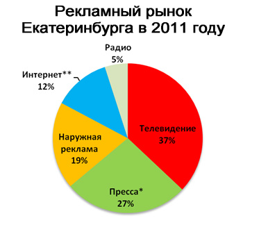 Однако запустив проект «Продажи GRP в Екате», мы, скажу вам откровенно, думали не только том, чтобы вложить в руки локальных агентств инструмент, который позволит местным рекламистам успешно конкурировать со своими московскими коллегами. Мы всерьез рассчитываем увеличить и наши собственные доходы. Сделать это позволит дисбаланс в долях телерекламы и печатной прессы на рекламном рынке Екатеринбурга. Доля ТВ в рекламном пироге нашего города в прошлом году была на 12% ниже средних показателей по России, которые приводит АКАР: по оценке «Алькасара», за девять месяцев 2011 года доля ТВ в Екатеринбурге составила всего 37%, а по данным АКАР этот же показатель по России достигает 48,7-49,2%. Доля же печатной прессы на 11% выше, чем в среднем по России – 27% по оценке «Алькасара» и 15,6% по данным АКАР, соответственно.