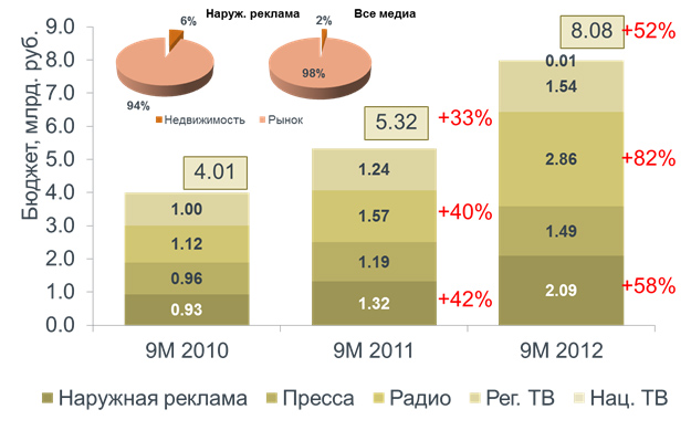 Темпы развития сегмента недвижимости вселяют надежду. Учитывая, что в расходах рекламодателей достаточная часть бюджетов направлена на наружную рекламу, можно смело заявить, что и в будущем мы можем ожидать увеличение инвестиций в эту отрасль.