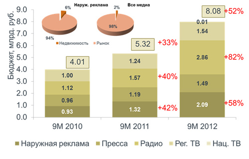 В категории «недвижимость» значительная часть затрат направлена на размещение в наружной рекламе и радио. Пресса и региональное ТВ используются рекламодателями в меньшей степени. В 2012 году в статьях расходов рекламодателей стало появляться национальное ТВ, но оно выражено минимальными цифрами. Таким образом, на первый план выходят наружная реклама и радио. Это можно объяснить тем, что через эти инструменты достижение основной целевой аудитории категории является наиболее эффективным.