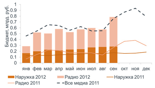 Важно отметить, что по наружке и радио объёмы растут быстрее, чем по категории в целом, то есть выбор этих медиа в достаточной степени обусловлен эффективностью эффективностью этих рекламных коммуникаций.