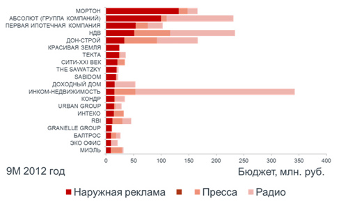 У крупнейших рекламодателей использование наружной рекламы занимает большую часть по сравнению с другими медиа. Это объясняется тем, что обычно размещение рекламы недвижимости осуществляется в непосредственной близости от рекламируемых объектов. Исключение составляет ИНКОМ-НЕДВИЖИМОСТЬ, который главный акцент сделал на радио.