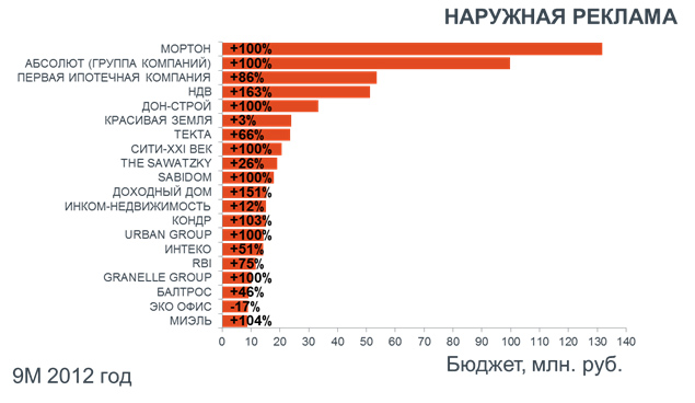 В наружной рекламе почти весь Топ-20, за исключением Эко-офиса, увеличивает свои бюджеты. Стоит заметить, что Дон-строй в 2011 году совсем не использовал наружную рекламу. А некоторые рекламодатели, такие как Абсолют, Сити-ХХI век, SABIDOM, URBAN GROUP и GRANELLE GROUP в 2011 размещались в наружке лишь 1-2 месяца, имея минимальные бюджеты. В 2012 году эти рекламодатели уделили наружной рекламе большее внимание.