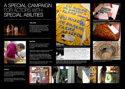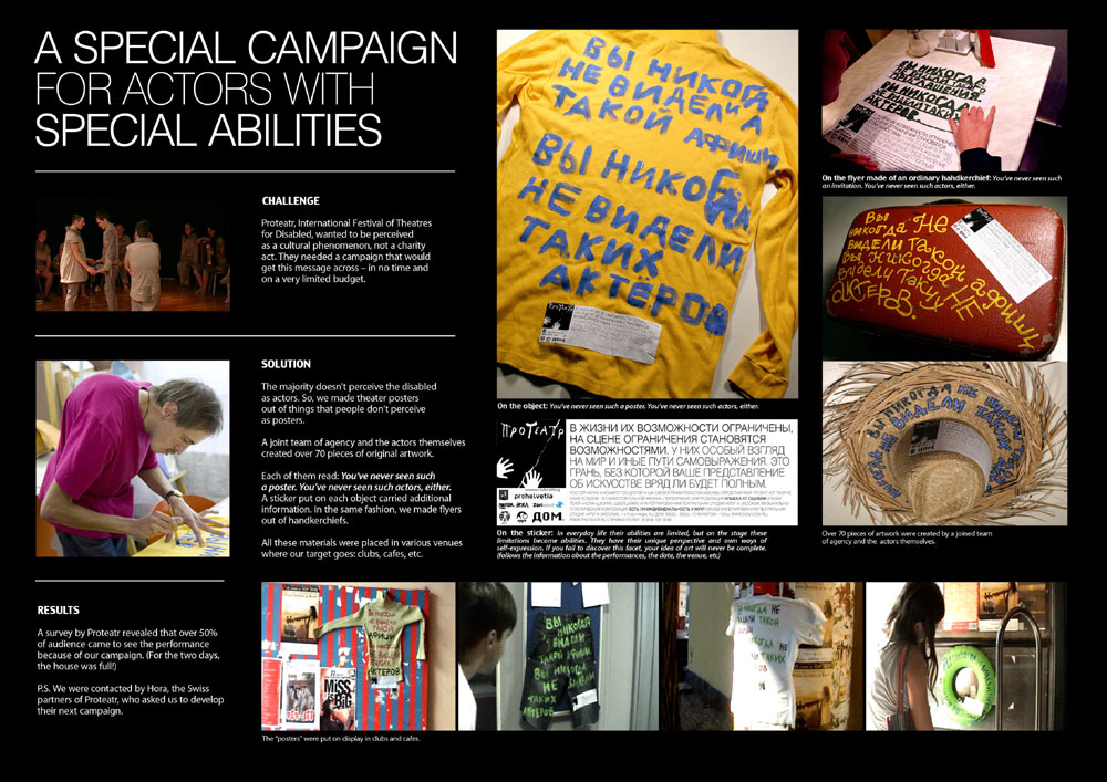 Бренд: "Leo Burnett Moscow" Клиент: "Leo Burnett Moscow" Авторы: "Илья Оленев, Светлана Гущина, Елена Куховар" "Актеры" Бренд: "Протеатр" Клиент: "Протеатр" Авторы: "Михаил Кудашкин, Наталья Павлова, Ольга Прохватилова" "Лодочка"