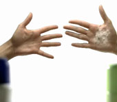 2 флакона: дез-антип Dove и спирт деодорант, пробуют на руку, женский голос "Дезодорант Dovе обеспечит вам совершенную защиту...", одуванчик, тит "спустя 12 ч", сжимают. показ ладони, флак КНЦ 3 разл флак тит и гол "соверш защита"