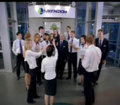 Служащие в офисе, заходит парень, на него все смотрят, выключается свет, диктор "Поздравляем, вы участник программы Мегафон Бонус...", поздравляют, дарят пакет, титры "программа Мегафон Бонус, значки, 5010 единый..., подробн...", парень выходит, забегают