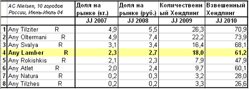 2. Марка заняла сильные позиции на рынке России. За период июнь-июль 04 г доля рынка Лабмер составила 2,3%***, лидеры сегмента Тильзитер и Ольтерманни имеют долю рынка 5% (данные марки представлены на рынке более 10 лет).Доля рынка Ламбер в Москве 3,2%