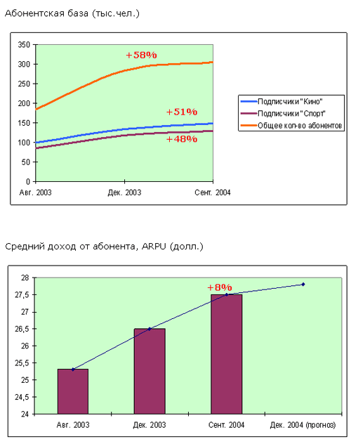 1. Рост численности абонентов НТВ-Плюс на 58% (до 284 тыс.чел. в декабре 2003 года и до 305 тыс.чел. в сентябре 2004 года).
