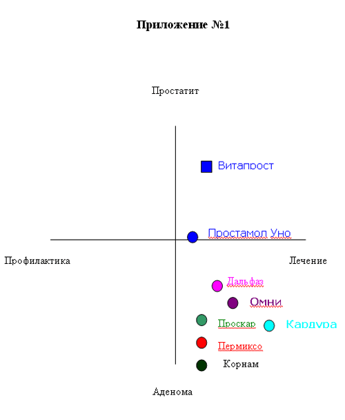 Витапрост - это препарат, созданный специально для лечения хронического простатита. Витапрост находится на высококонкурентном рынке препаратов для лечения заболеваний предстательной железы. Данная группа характеризуется динамичным ростом, опережая рост фармацевтического рынка РФ в целом, доля подгруппы в 2002 году составляла в долларовом эквиваленте - 1,53%; в 2003 году - 1,8%; в 2004 году - 2,1% (1-2 квартал 2004 года) (По данным RMBC). При этом на рынке данной подгруппы присутствуют сильные бренды западных компаний: Простамол-Уно (10,2 % доля на рынке препаратов для лечения заболеваний предстательной железы в долларовом эквиваленте по итогам 2003 года/), Дальфаз (5,5% доля на рынке препаратов для лечения заболеваний предстательной железы в долларовом эквиваленте по итогам 2003 года), Омник (5,88% доля на рынке препаратов для лечения заболеваний предстательной железы в долларовом эквиваленте по итогам 2003 года). На фоне конкурентов позиционирование препарата Витапрост является его внешним конкурентным преимуществом, т.к выгодно оличает его от основной массы конкурентов (см.Приложение №1).