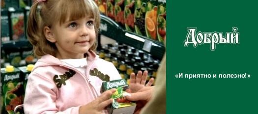 А вот пластиковые бутылочки, в которые сейчас разливают Botaniq, Rich, Frustyle, Я - это действительно очень удобная штука. Их можно положить в дамскую сумочку и в автомобиль, открыть, отпить и засунуть обратно. Именно эта симпатично оформленная тара «Я. Десерт манго-кокос» и «Я. Десерт манго-ананас» однажды привлекла мое внимание на одной из заправок ВР. 2 маленькие бутылки в прозрачной коробке стояли рядом с кассами и я, не зная, что такое «десерт» и смогу ли я его пить, все же их купила. Через неделю я искала «Десерт» на полках «7 континента», однако обнаружила только Botaniq «Банан и Клубника» и «Лесные ягоды», от которых пришла в полнейший восторг и даже прочитала все тексты, размещенные на бутылке. От них мне слегка поплохело, но от «Банана и Клубники» я все же не отказалась. Ну действительно, можно ли доверять свое здоровье людям, производящим то, что ты вливаешь внутрь себя и пишущим такие воззвания: «А утром наступит лето. И где-то очень далеко ночной бриз незаметно сменится дневным, а тот принесет аромат созревших бананов. И на столиках еще безлюдного приморского кафе будет лежать клубника. И кто-то задумчиво тронет клавиши...» - Какие созревшие бананы? Какие клавиши? Зачем вы все это мне написали? - очень хотелось спросить у творцов, - Мне не нужны ваши личные психологические якоря, чтобы просто выпить сока. Вообще-то реклама соков - это, наверное, самая непонятная для меня их составляющая. Начать с того, что никакой другой, кроме телевизионной, я не замечаю. Скорее всего, это связано с особенностями моей жизни - прессу я не читаю, плакаты на улицах города не понимаю, а в инете соки не рекламируются. Так что на мою долю остаются только ТВ-ролики и мнение друзей. Впрочем, последний упомянутый мною источник информации я тоже не слишком жалую. А по телевизору необходимые для функционирования моего организма напитки показывают так, что они все сливаются в одну большую прерывающуюся художественными фильмами частушку. Точнее, в три частушки. Первая - про детей. Исполнитель детских частушек «Моя семья» ведет свою партию уже довольно давно, нещадно паразитируя на образе Дианы, которой уже замуж пора, а мы ее все помним крошкой, беспардонно забегающей в спальню к родителям с пугающим воплем «С добрым утром, мамочка!». Диана, безусловно, была очаровательна. Не менее прекрасна она и сейчас, в образе Лолиты. Но причем здесь сок, который я пью? Второй же детский частушечный запевала, «Фруктовый сад», начинал просто сногсшибательно, дав почву для нескончаемых анекдотов сначала про дедушку («А я поливал!» «Это в яблочном 10 яблок. А представляешь, сколько их в виноградном!»), затем про детский праздник («А я Кирилл. Я сегодня не курил», «А я маракуйя. Даже не знаю, что еще и сказать»). Но в дальнейшем «ФС» кардинально поменял ориентацию с вечного безделья на тяжелый труд и теперь без зазрения совести показывает зрителям эксплуатацию детской рабсилы на заводах по переработке фруктов и овощей. У третьего детского частушечника, «Доброго», репертуар смешанный. Дети упоминаются или только вместе со взрослыми, или взрослые сами впадают в детство, или детей вообще в кадре съемок родильного дома пока нет, но они предполагаются. Вторая группа исполнителей выбирает сексуальные частушки. J-7, которому, видимо, никак не удается забыть свой успех на проекте «Последний герой», до сих 