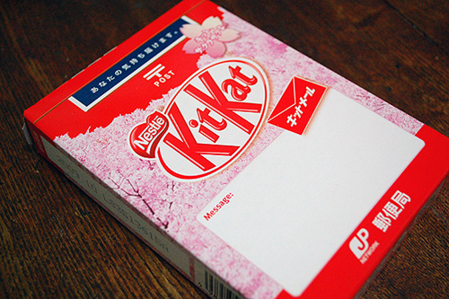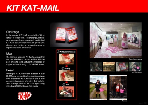 В центре концепции рекламы находилось сходство слов "kit kat" с японской фразой "Kitto Katso" , что значит "безусловный победитель". Используя эту игру слов, японское агентство создало фирменные открытки Kit-Kat, распространявшиеся только в почтовых отделениях страны.