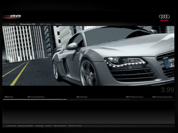 The aim of the microsite was to present the characteristics of athleticism and progressivism in an emotional way, enabling people to experience Audi's expertise in the area of sports cars while establishing the R8 in the relevant set of sports car buyers. The main challenge involved in creating a compact and emotional product presentation for this for a, mainly male target group was making sure that it would offer a great deal of information and opportunities for interaction.