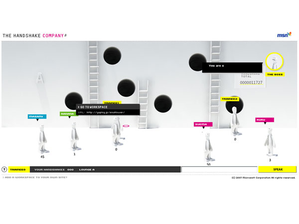 The MSN HANDSHAKE SYNDICATE is a consumer generated, peace&friendship campaign for MSN. It offers people chances to handshake and to syndicate the experience of the touching feeling when people first get through to each other. The rule is simple; to stand up and offer your hand to people you don't even know. As handshaking symbolises the act of affection and cooperation, the campaign aims to empower the brand of MSN by independently showing that the Internet can actually be a help in undertaking a part of the difficult task for world peace and friendship between the nations.