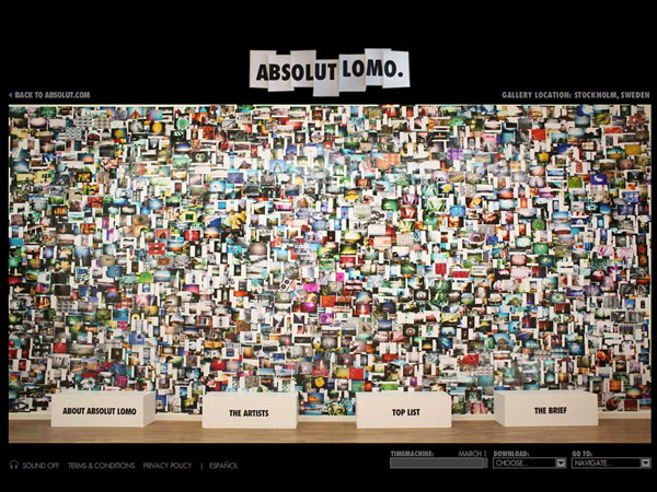 Together with the client and the Lomographic Society, Great Works has developed ABSOLUT LOMO. The first task was to build a gallery in central Stockholm and focus a time lapse camera on it. The ABSOLUT LOMO campaign's print advertising displed how dedicated Lomo artists have interpreted ABSOLUT VODKA with pictures. This is also the base for the online photo exhibition, but the really cool thing is that people like you and me are invited to interpret the ABSOLUT BRAND. Target Group: Those of legal drinking age (21 in most markets) to 35 years old, mainly living in metropolitan areas.