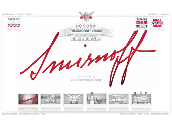 Smirnoff.com is the new global digital communications platform for Smirnoff, the world's best selling premium Vodka. The site provides an immersive experience for users, allowing them to celebrate Smirnoff's rich Russian roots. The main feature of the site, the 'Signature' section, provides more in-depth historical facts, asking users to pause and reflect about their own history and share similar milestones from their own lives. Users can create their own signature video and send these personalised signatures to their desktops and mobile phones or post them at YouTube.