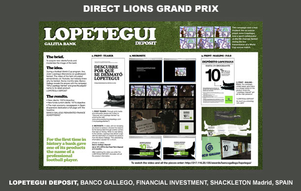 В конкурсе Direct Lions приняло участие 1689 заявок. Гран-при получило испанское агентство Shackleton Madrid с работой «Lopetegui Deposit» («Депозит Lopetegui»)для Banco Gallego. В основу сюжета легла история бывшего голкипера «Барселоны» Джулена Лопетегуи (Julen Lopetegui), который упал в обморок во время последнего кубка мира. ответом на вопрос, почему вратарь упал в обморок, спустя месяцы ответила реклама мадридского банка.