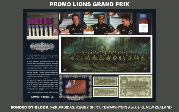 На участие в Promo Lions было подано 786 заявок. Гран-при за работу под названием «Bonded by blood» ("Связанные кровью") для Adidas получило новозеландское агентство TBWAWHYBIN (180TBWA).По сюжету ролика «Связанные кровью», все члены команды Новой Зеландии по регби стали донорами и сдали свою кровь. Часть крови смешали и добавили в типографскую краску, которую использовали при печати восьмитысячного тиража постеров. Таким образом, каждый, кто приобретет майку для регби от Adidas. получит постер с ДНК спортсменов.