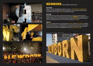 We chose the word "NEWBORN" to encapsulate everything that the independence was going to bring to the country, in one word, intentionally in English, to globally pass on the message of a newest country being born. We then turned this word into an interactive sculpture, to mark this event with a symbol that would be part of this day and the people that gathered around it. This would be used as a tool for the people to express all their emotions via black permanent markers, which we provided during the event. This lasted throughout 17 Feb 2008.