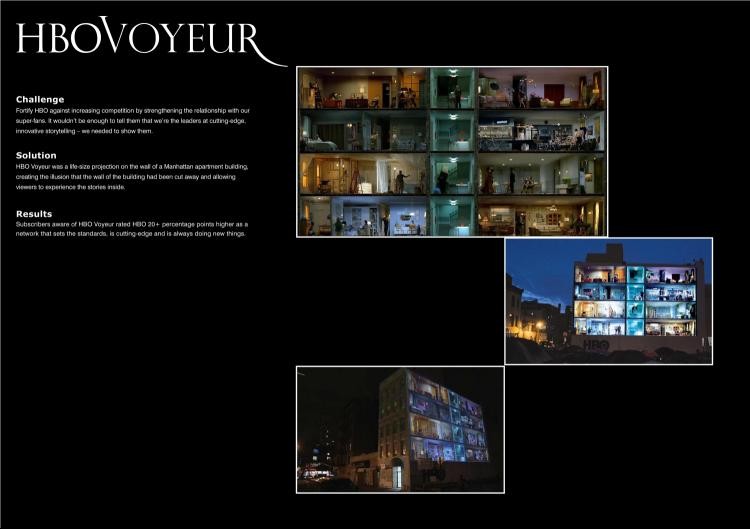 HBO Voyeur began with an event on 28/06/2007: a life-size projection on the wall of a Manhattan apartment building, creating the illusion that the wall had been cut away. Viewers became voyeurs with a view of the stories inside. The actions of each apartment were choreographed to match up with the other apartments as the drama unfolds. All of this served to provide consumers with a unique perspective into a common story, as they have come to expect from HBO.
