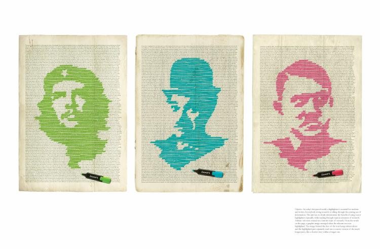 Ads were created on a typical topic of research and from the words on the page; the iconic image of that research topic was brought to life using highlighters. The highlighted part separately read was a concise version of the much longer piece, like a shorter story within a longer one. This idea was taken onto posters that were put up in co