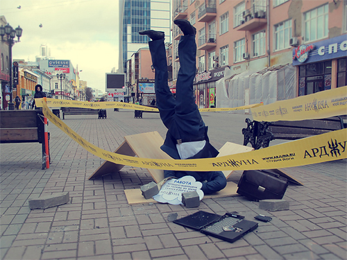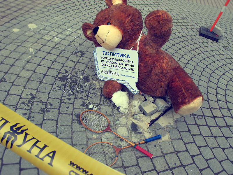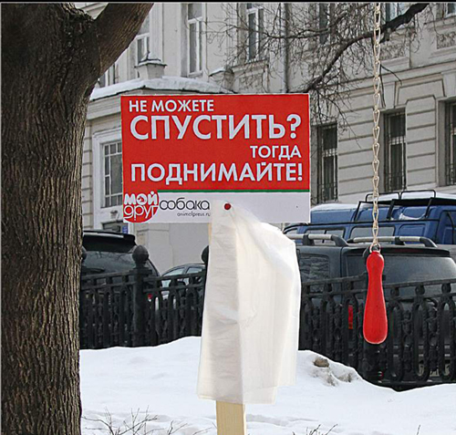 «Туалеты» - это акция для журнала «Мой друг собака», в рамках которой в Московских парках и на бульварах развешивались яркие унитазные цепочки для слива воды. Под ними были небольшие плакаты «Не можете спустить? Тогда поднимайте!». Там же были размещены пакеты для сбора собачьих экскрементов.