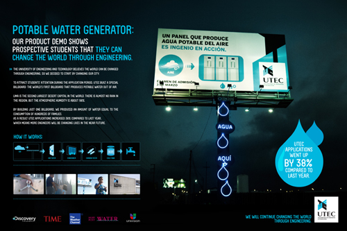 Advertiser : THE UNIVERSITY OF ENGINEERING AND TECHNOLOGY Product : ADMISSIONS 2013 Entrant : MAYO DRAFTFCB Lima, PERU Type of Entry : Use of Promo & Activation Category : Best Use of Ambient in a Promotional Campaign Title : POTABLE WATER GENERATOR Advertiser/Client : THE UNIVERSITY OF ENGINEERING AND TECHNOLOGY Product/Service : ADMISSIONS 2013 Entrant Company : MAYO DRAFTFCB Lima, PERU Advertising Agency : MAYO DRAFTFCB Lima, PERU