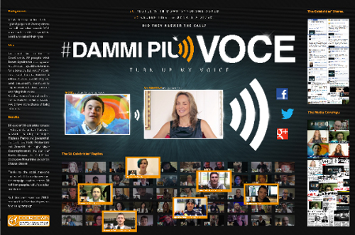 Advertiser : COORDOWN ONLUS Product : WORLD DOWN SYNDROME DAY Entrant : SAATCHI & SAATCHI Milan, ITALY Type of Entry : Use of Promo & Activation Category : Best use of Social Media Marketing in a Promotional Campaign Title : #DAMMIPIГ™VOCE - TURN UP MY VOICE Advertiser/Client : COORDOWN ONLUS Product/Service : WORLD DOWN SYNDROME DAY Entrant Company : SAATCHI & SAATCHI Milan, ITALY Advertising Agency : SAATCHI & SAATCHI Milan, ITALY