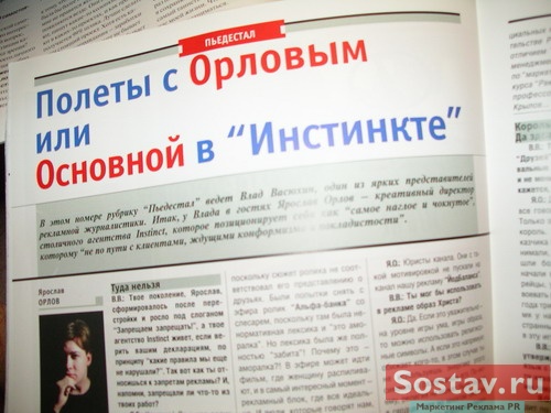 Вышел журнал «Рекламные технологии», где в рубрике «Пьедестал» мое интервью с Ярославом Орловым (подробности – «Карт-бланш №6»). Шесть, между прочим, полос с картинками. Сижу, читаю.