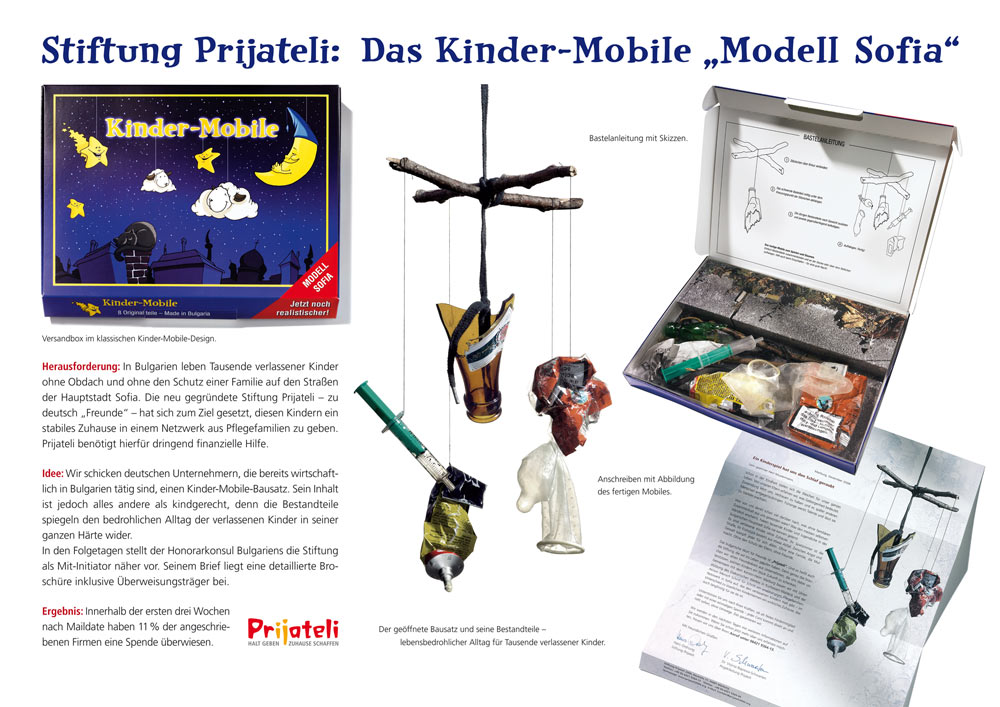 Заказчик – фонд помощи бездомным болгарским детям Prijateli. В красивой коробке, которую разослали в немецкие компании, имеющие бизнес на территории Болгарии, оказались «игрушки» маленьких софийских беспризорников. Использованные шприцы и презервативы, осколки пивных бутылок, тюбики из-под клея и тому подобный реальный мусор с городских улиц. Из всего этого приятели делают свой Das kinder-mobile. Еще в коробке было письмо с просьбой перечислить деньги в фонд.