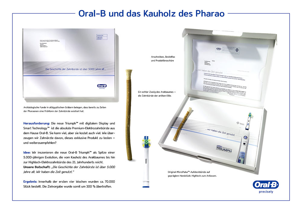 Другая «золотая» работа этого агентства – продвижение новой зубной щетки: «Oral-B и дерево, разжеванное фараоном». Идея проста, правильнее сказать, прозрачна и креативна: можно чистить зубы расщепленной веточкой, как древние египтяне, но электрическая щетка лучше. Можно сравнить и почувствовать разницу.