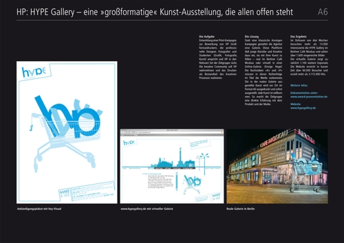 Гран-при конкурса получила кампания Hype Gallery, которую Publicis Hamburg сделала для Hewlett-Packard. Об идее этой международной акции по продвижению принтеров HP среди творческих людей (каждый желающий мог принести и распечатать свою картинку или фото) я подробно писал на «Составе» еще в 2005 году, когда галерея Hype функционировала в Москве ( /columns/rek-time/2005/stat35/). Теперь очередь дошла до Берлина, а в качестве галерейного пространства там было выбрано кафе Moskau, что приятно.