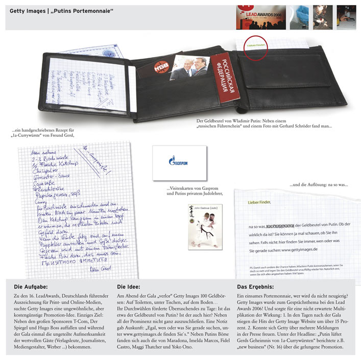 Но более широко и весомо «русская тема» была представлена в другой работе, получившей золотой трофей в своей номинации. Мюнхенское агентство Heye, 121 предложило весьма нетривиальную промо-акцию фотобанку Getty Images. Кампания называется «Портмоне Путина». В 2006 году на приеме после церемонии вручения LeadAwards, это такая немецкая премия для медиа, повсюду были разбросаны кошельки. Всего 100 штук. Денег или кредитных карточек в них не было, но имелись иные бумажки, бегло изучив которые можно было сделать вывод, что принадлежит этот предмет российскому президенту. Среди прочего – удостоверение КГБ, визитка личного тренера по дзюдо, фотография ВВП с тогдашним канцлером Герхардом Шредером и даже рецепт любимого блюда экс-канцлера, написанный якобы им самим. А еще – обращение к «дорогому нашедшему» с предложением зайти на сайт gettyimages.de. Говорят, всю вечеринку люди находили эти портмоне, веселились и говорили… нет, не о Путине. О Getty Images. Что и требовалось заказчику.